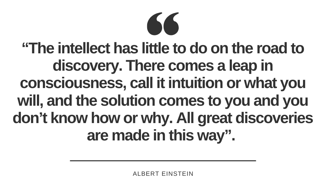 “The intellect has little to do on the road to discovery. There comes a leap in consciousness, call it intuition or what you will, and the solution comes to you and you don’t know how or why. All great discoveries are made in this way”. -Albert Einstein
